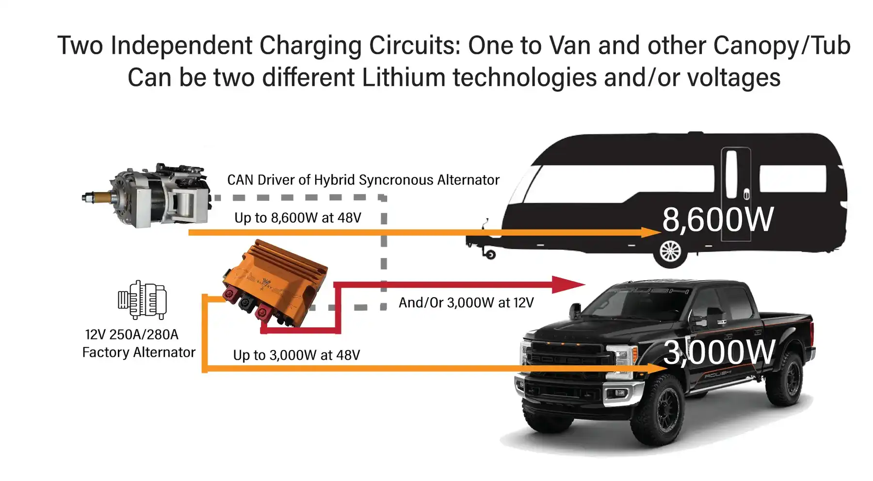 250A DC DC charging with 100% protection of the alternator. Then add the hybrid high power alternator for an additional 5-8kW of power.