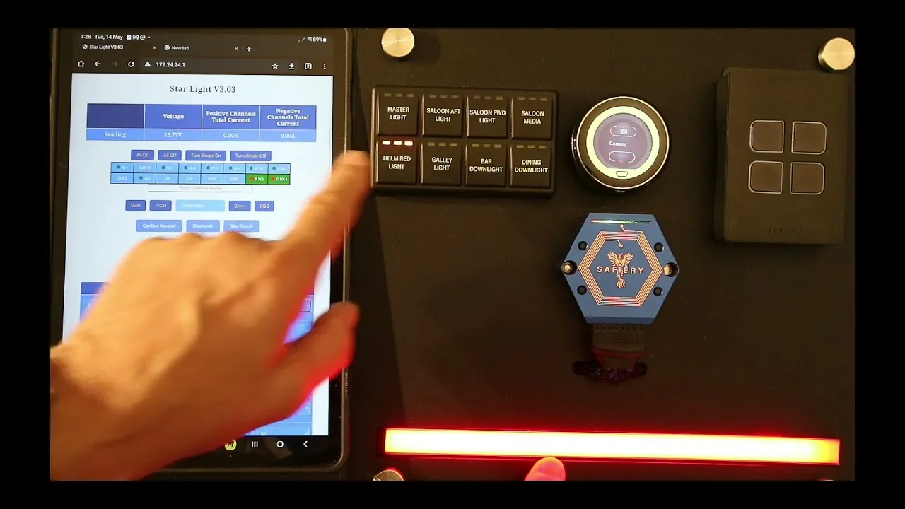 - STAR-switch water proof 8 button switch. Each button can switch dual colour channels (one press white, second press amber – same button) So 8 buttons can manage 10 channels.