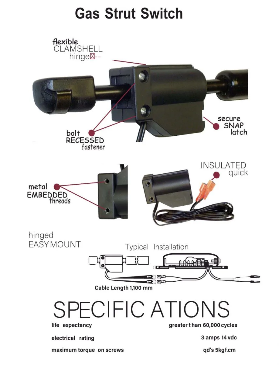 This gas strut switch wires into the positive circuit for canopy door lights so that they come on automatically when opened. The switch is designed to close the circuit when it is opened and open the circuit when closed. It takes less than a few minutes to install on gas strut.