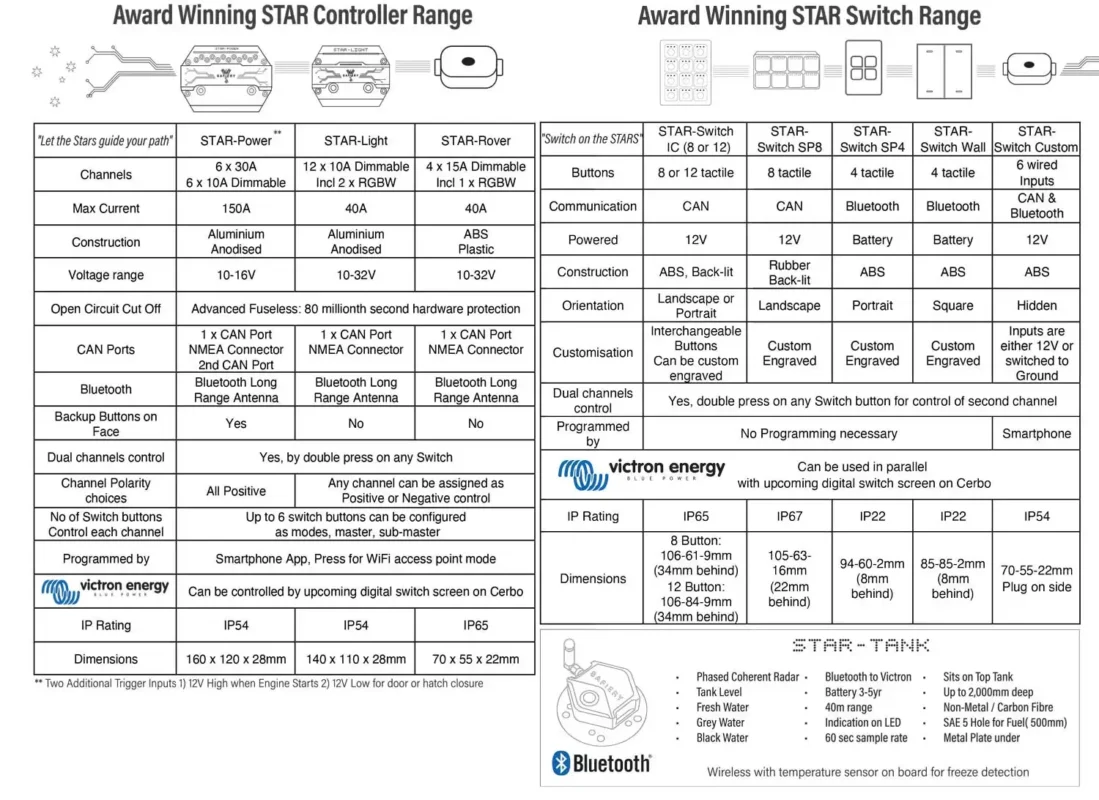 All controllers include both CAN bus connectivity (for Victron, NMEA, and wired keypads), Bluetooth Long Range (for wireless switches and smartphone configuration) and Matter WiFi for apple, Google Samsung or Amazon connectivity. All three modes can occur simultaneously.